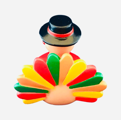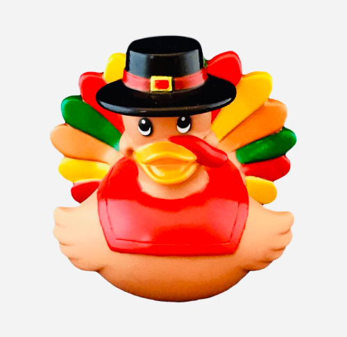 This Thanksgiving, add some fun to your decorations with our Turkey Rubber Duck. With its fantastic Fall-feathered coat and pilgrim hat, it's perfect for centerpieces, place settings, or even as a holiday giveaway. Approximate size: 3 3/8" W x 3 1/4"H x 3 1/8"L.
