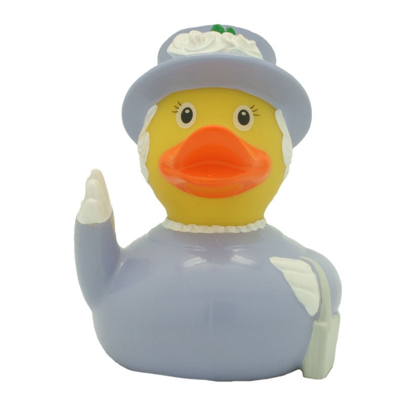 Royal Queen Rubber Duck. Buy the royal majesty. In grey dress and hat, with handbag. Kindly waving to the people.