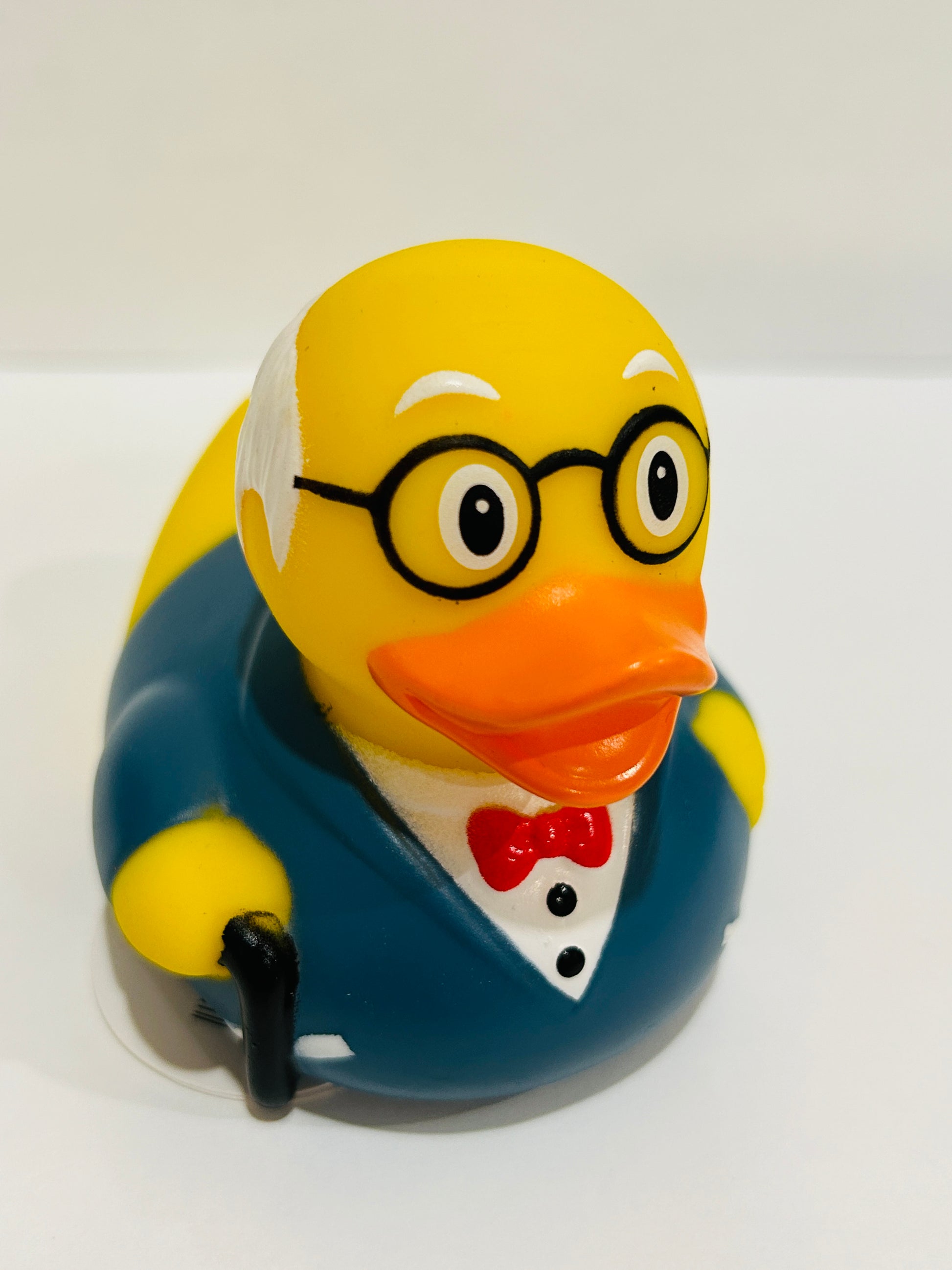 Granddad Rubber Duck. With walking stick, glasses, suit and bow tie.