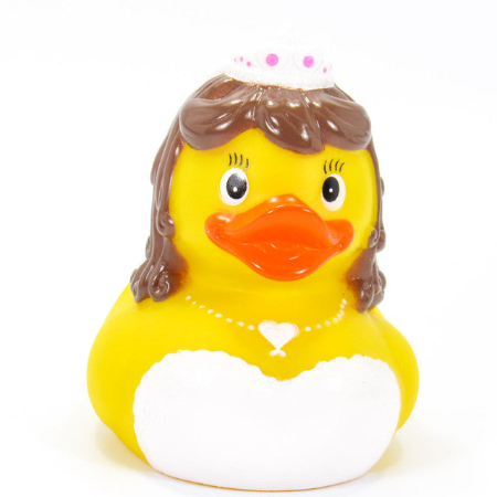 This bold Bride rubber duck is ready to take the plunge and tie the knot! Its approximate size is 3 3/8" W x 3 1/4"H x 3 1/8"L, perfect for an adventurous wedding.