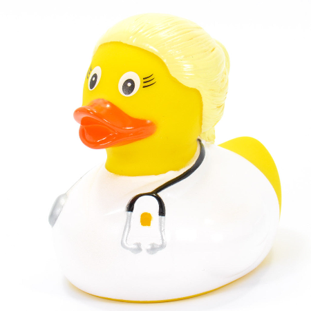 The fearless woman in charge of saving lives - Dr. Blonde with bobbing hair and a classic rubber duck outfit - complete with a white overcoat, glasses, and a trusty stethoscope. Measuring at an approximate size of 3 3/8" W x 3 1/4"H x 3 1/8"L.